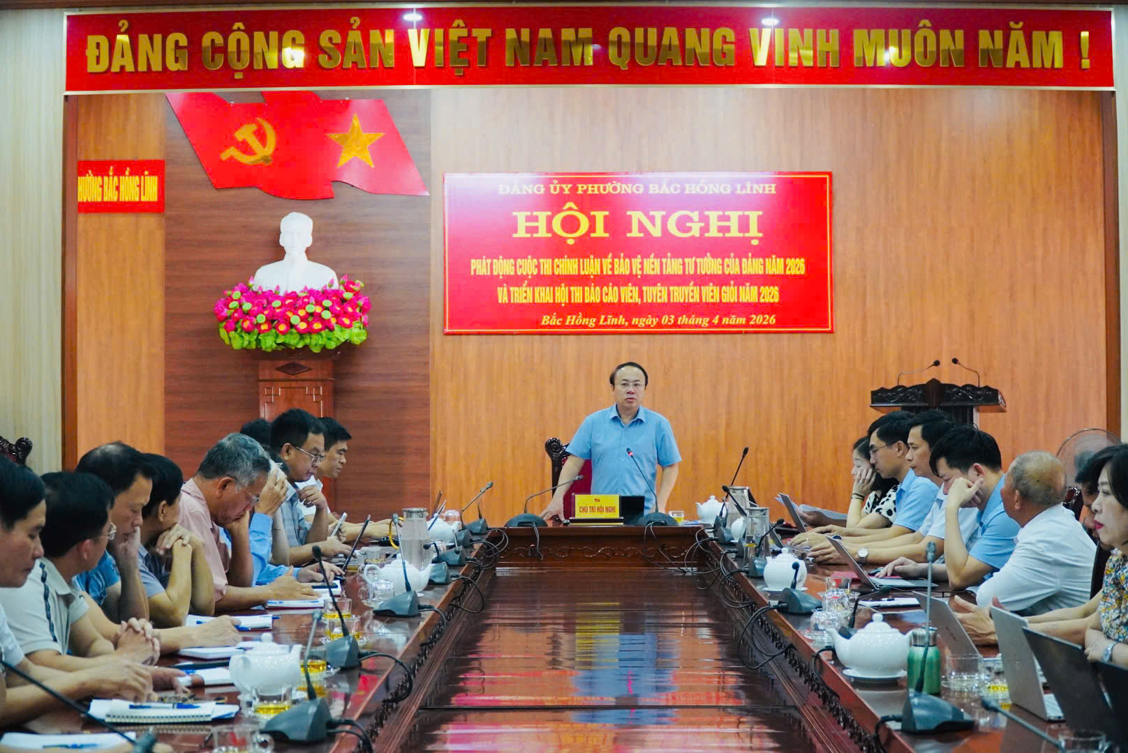 Chiều ngày 03/4, Ban Thường vụ Đảng ủy phường Bắc Hồng Lĩnh tổ chức hội nghị phát động cuộc thi chính luận về bảo vệ nền tảng tư tưởng của Đảng năm 2026; triển khai hội thi báo cáo viên, tuyên truyền viên giỏi năm 2026 và một số nội dung quan trọng khác. Đồng chí Nguyễn Quang Vinh, Phó Bí thư Thường trực Đảng ủy phường chủ trì hội nghị.
