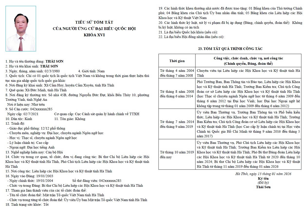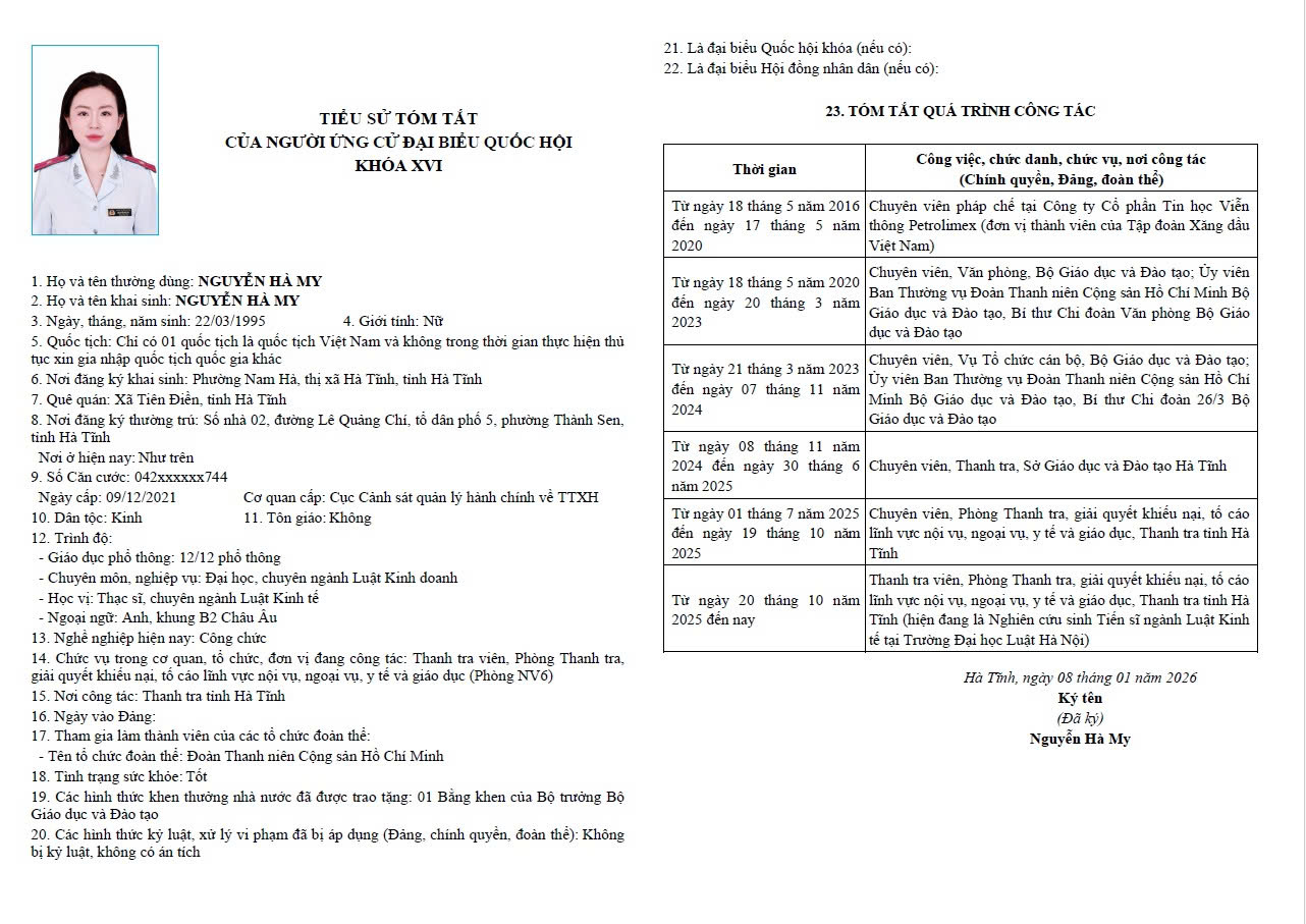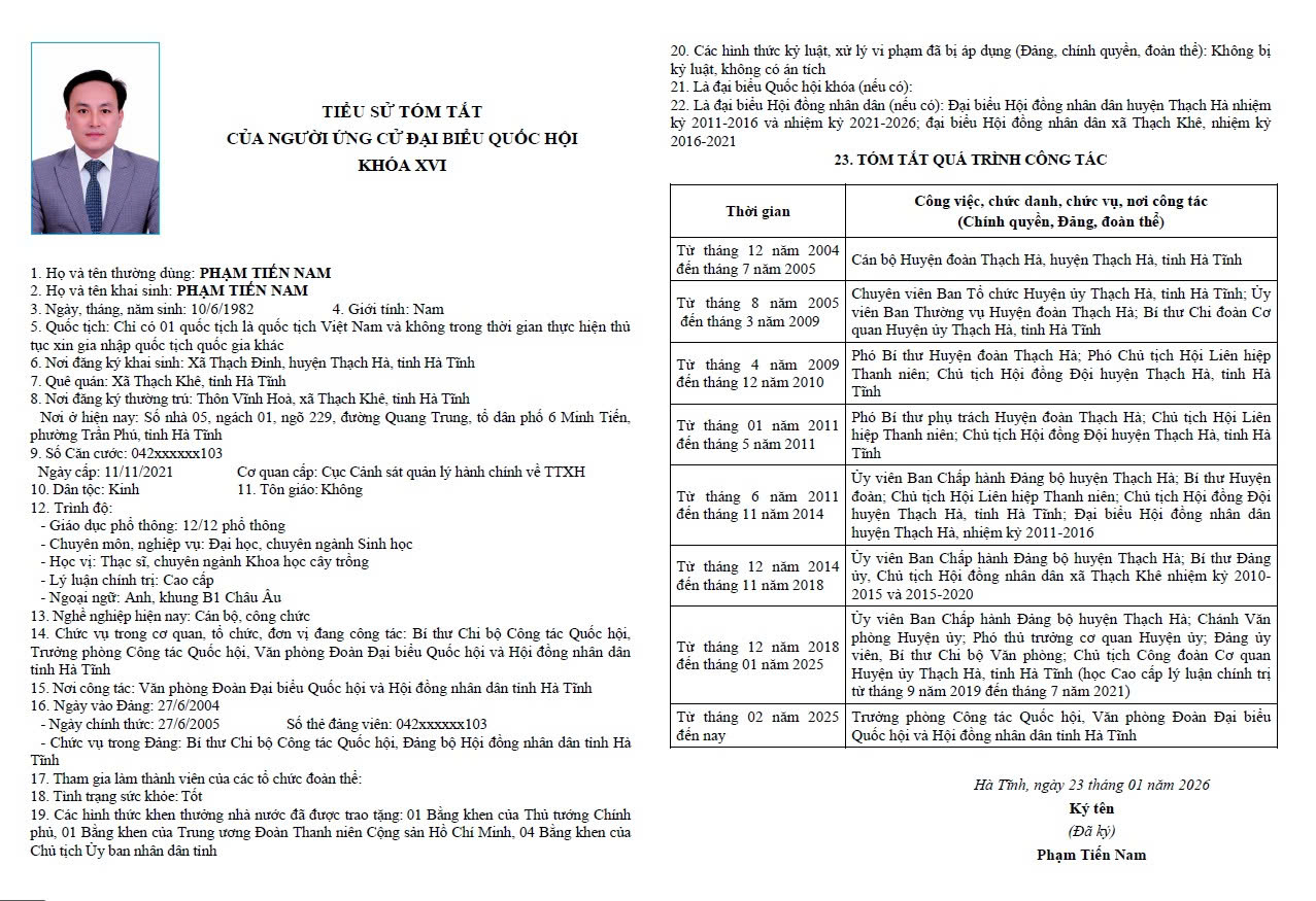 Thực hiện Nghị quyết số 151/NQ-HĐBCQG ngày 14/2/2026 của Hội đồng Bầu cử quốc gia về việc công bố danh sách chính thức những người ứng cử ĐBQH khóa XVI theo từng đơn vị bầu cử trong cả nước (gọi tắt là Nghị quyết số 151), ngày 16/2/2026, Ủy ban bầu cử (UBBC) tỉnh Hà Tĩnh đã ban hành Thông báo số 41/TB-UBBC công bố danh sách người ứng cử ĐBQH theo từng đơn vị bầu cử của tỉnh theo Nghị quyết 151.