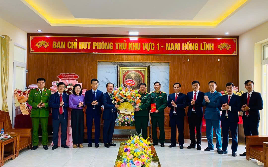 Tặng hoa chúc mừng Ban Chỉ huy phòng thủ khu vực Nam Hồng Lĩnh