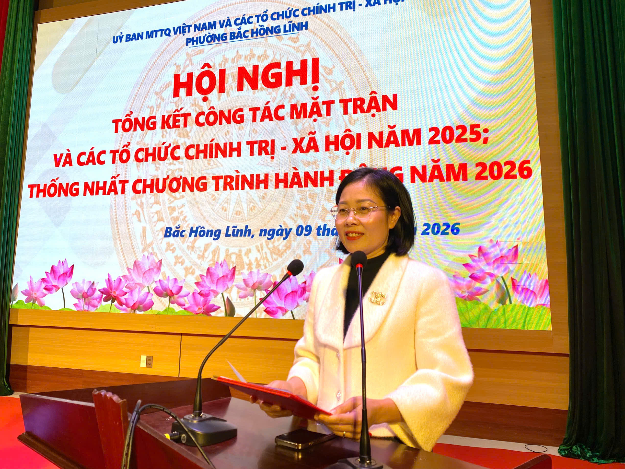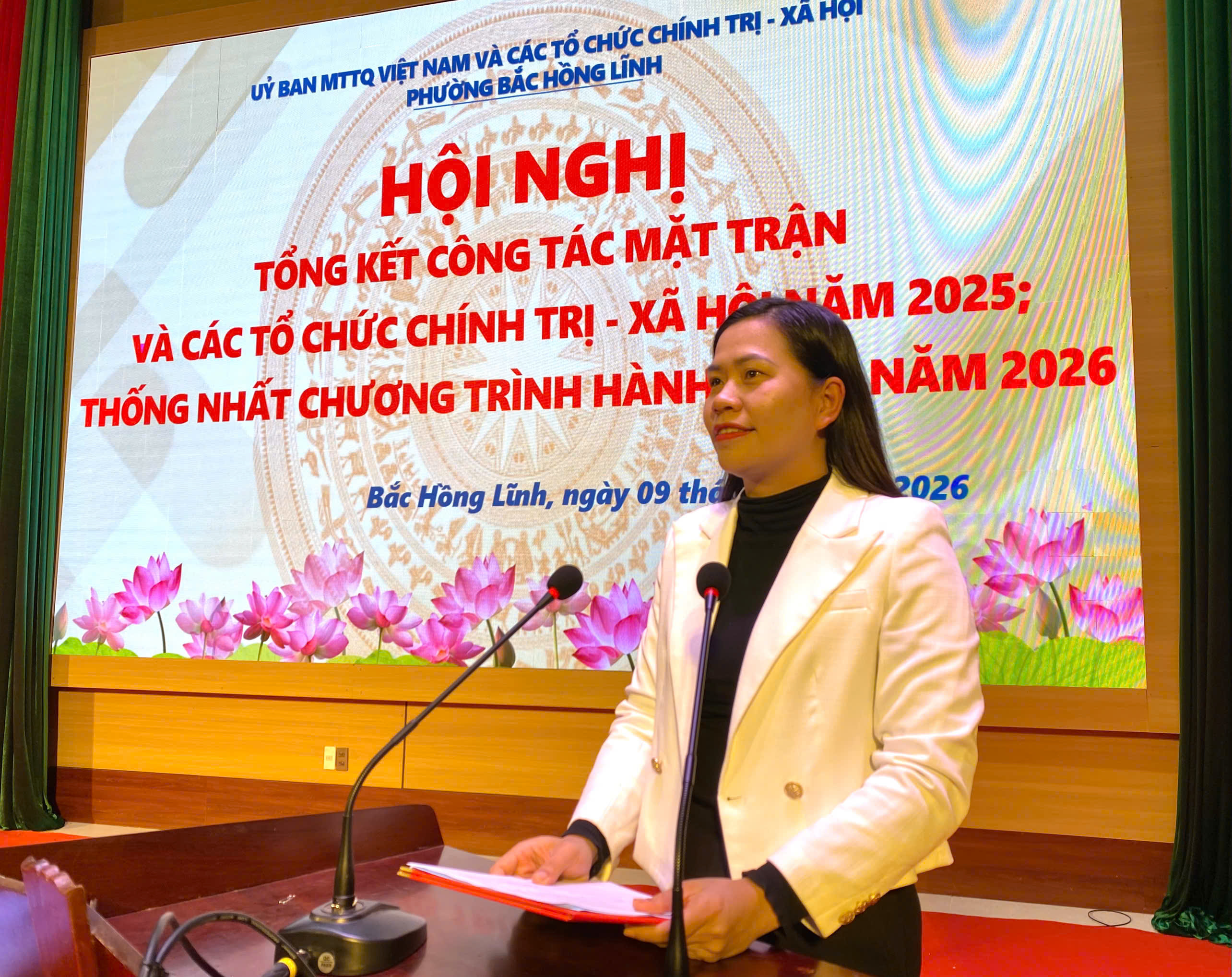Chiều ngày 09/01, Ủy ban MTTQ Việt Nam phường, các tổ chức chính trị - xã hội tổ chức Hội nghị tổng kết công tác Mặt trận, các đoàn thể năm 2025, triển khai nhiệm vụ thống nhất hành động năm 2026. Dự hội nghị có các đồng chí trong Thường trực Đảng ủy, HĐND, UBND phường; Trưởng, Phó Ban xây dựng Đảng; Chủ nhiệm UBKT Đảng uỷ phường; Trưởng Công an phường, Chỉ huy trưởng BCH Quân sự phường; Đại diện lãnh đạo: Văn phòng Đảng uỷ, Trung tâm Chính trị; phòng Kinh tế Hạ tầng và Đô thị, phòng Văn hoá - Xã hội, Văn phòng HĐND & UBND; Trung tâm Phục vụ hành chính công phườnglãnh đạo các tổ chức chính trị – xã hội và Trưởng Ban Công tác Mặt trận 31 tổ dân phố, Ủy viên BTV, BCH các tổ chức: Hội LHPN, Hội Nông dân, Hội cựu chiến binh, Đoàn TNCS Hồ Chí Minh phường; đại diện các tập thể, cá nhân được khen thưởng.