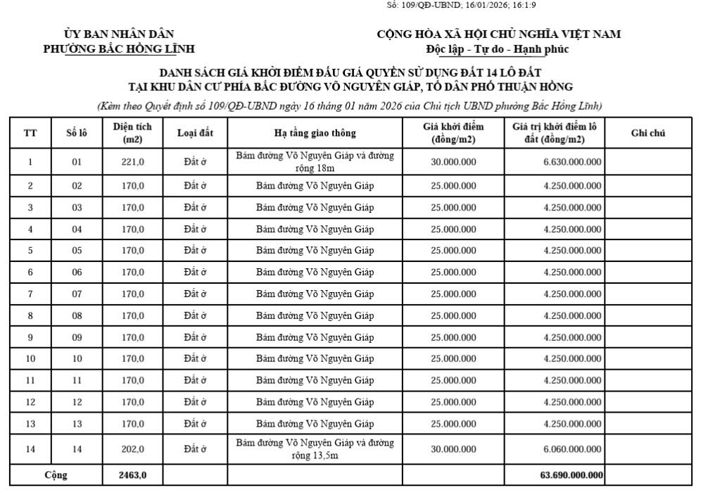 Phê duyệt giá khởi điểm đấu giá quyền sử dụng đất 14 lô đất tại Khu dân cư phía Bắc đường Võ Nguyên Giáp, tổ dân phố Thuận Hồng BBT20/01/2026A -A+BBT20/01/2026A -A+