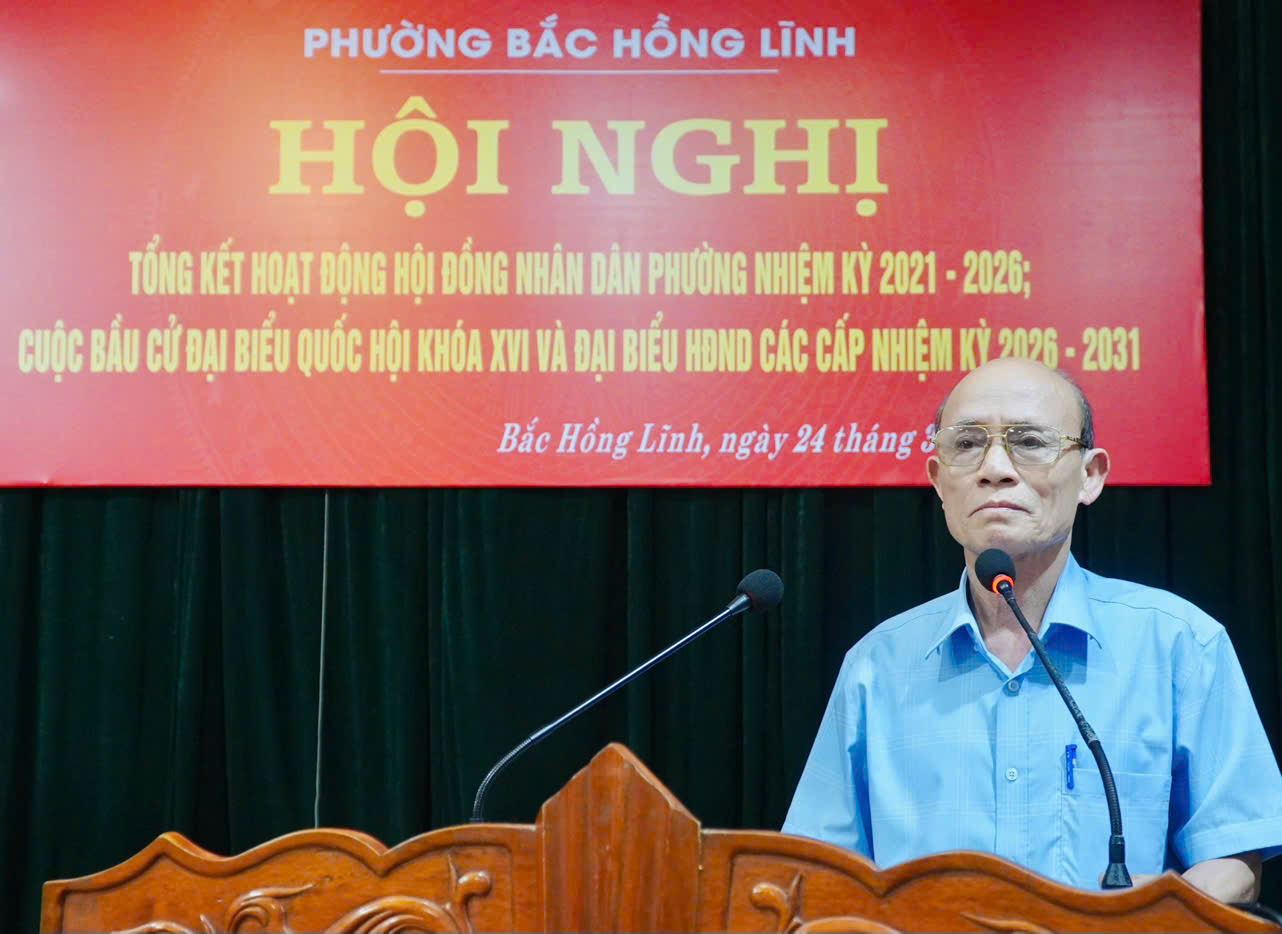 Chiều ngày 24/03, HĐND phối hợp với UBBC phường Bắc Hồng Lĩnh tổ chức Hội nghị tổng kết hoạt động HĐND phường nhiệm kỳ 2021-2026; Cuộc bầu cử đại biểu Quốc hội khoá XVI và đại biểu Hội đồng nhân dân các cấp nhiệm kỳ 2026-2031. Các đồng chí Nguyễn Thăng Long, Bí thư Đảng ủy – Chủ tịch HĐND phường; Trần Xuân Đức, Phó Bí thư Đảng ủy – Chủ tịch UBND phường chủ trì Hội nghị.