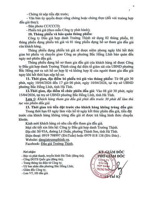 Thông báo đấu giá 13 lô đất phía Bắc đường Võ Nguyên Giáp (đợt 2) BBT28/03/2026A -A+BBT28/03/2026A -A+ File đính kèmThông báo đấu giá Phường Bắc Hồng Lĩnh.pdf