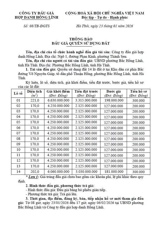 Thông báo đấu giá quyền sử dụng đấtBBT23/01/2026A -A+BBT23/01/2026A -A+ File đính kèmThông báo đấu giá.pdf