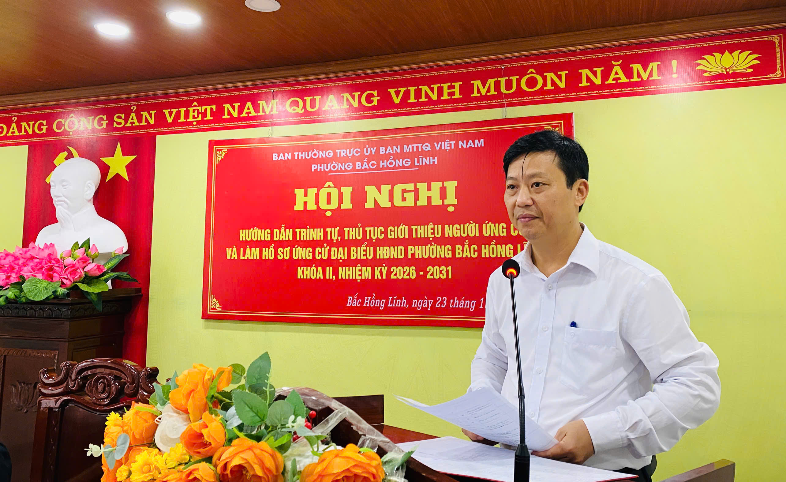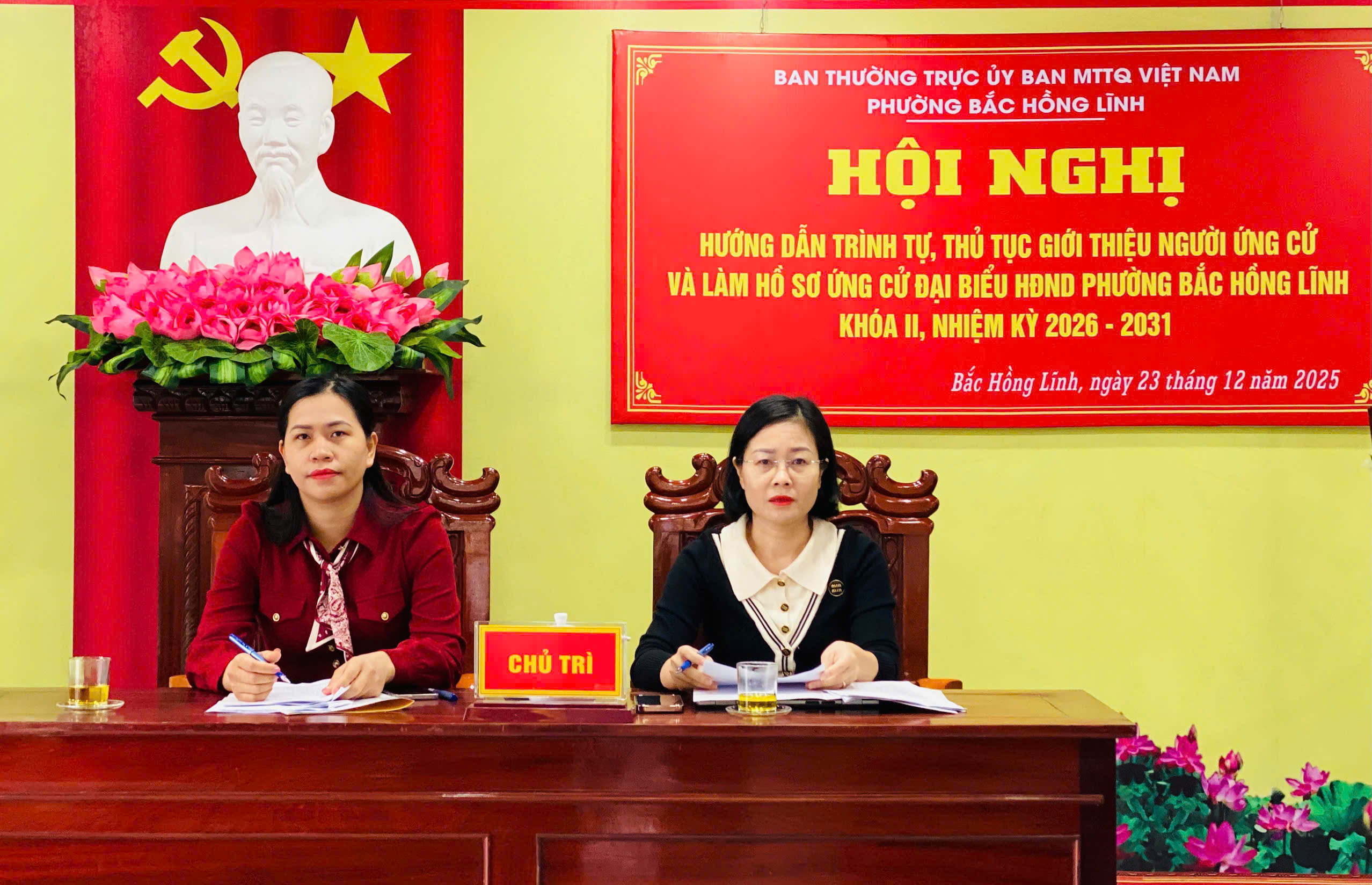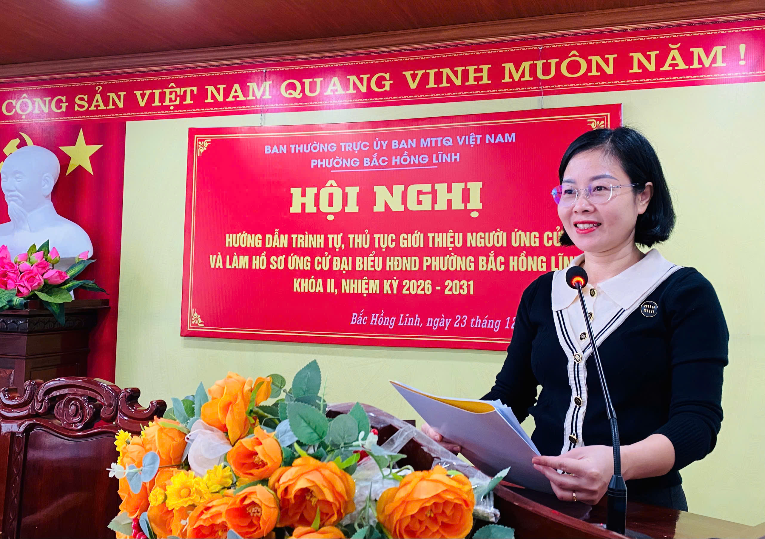 Sáng ngày 23/12, Ban Thường trực Ủy ban MTTQ Việt Nam phường Bắc Hồng Lĩnh tổ chức hội nghị hướng dẫn trình tự, thủ tục giới thiệu người ứng cử đại biểu Hội đồng nhân dân phường Bắc Hồng Lĩnh khóa II, nhiệm kỳ 2026 - 2031.
